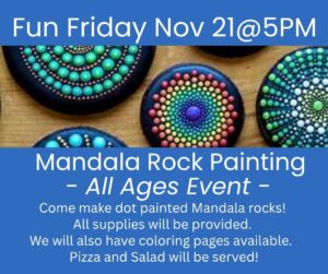 112125 Fun Friday Family Event! Friday November 21rst @500pm Family paint Night!! Come make dot painted Mandala rocks! We will also have coloring pages available! All supplies will be provided!! P